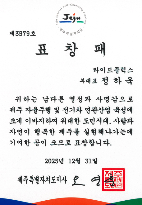 3. 제주특별자치도지사 표창 - 부대표 (2025.12) 제주 자율주행 연관산업 육성 이바지한 공로로 제주특별자치도지사 표창 수상