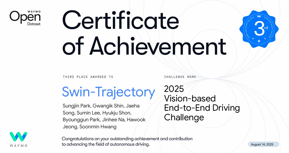 4. 세계 최대 AI 학회 'CVPR 2025' Waymo 자율주행 챌린지 3위 (2025.08) 글로벌 인공지능 학회 CVPR '비전 기반 End-to-End 자율주행 챌린지'에서 한양대와 공동 참가하여 세계 3위에 입상, 글로벌 수준의 인지 및 판단 기술력을 입증